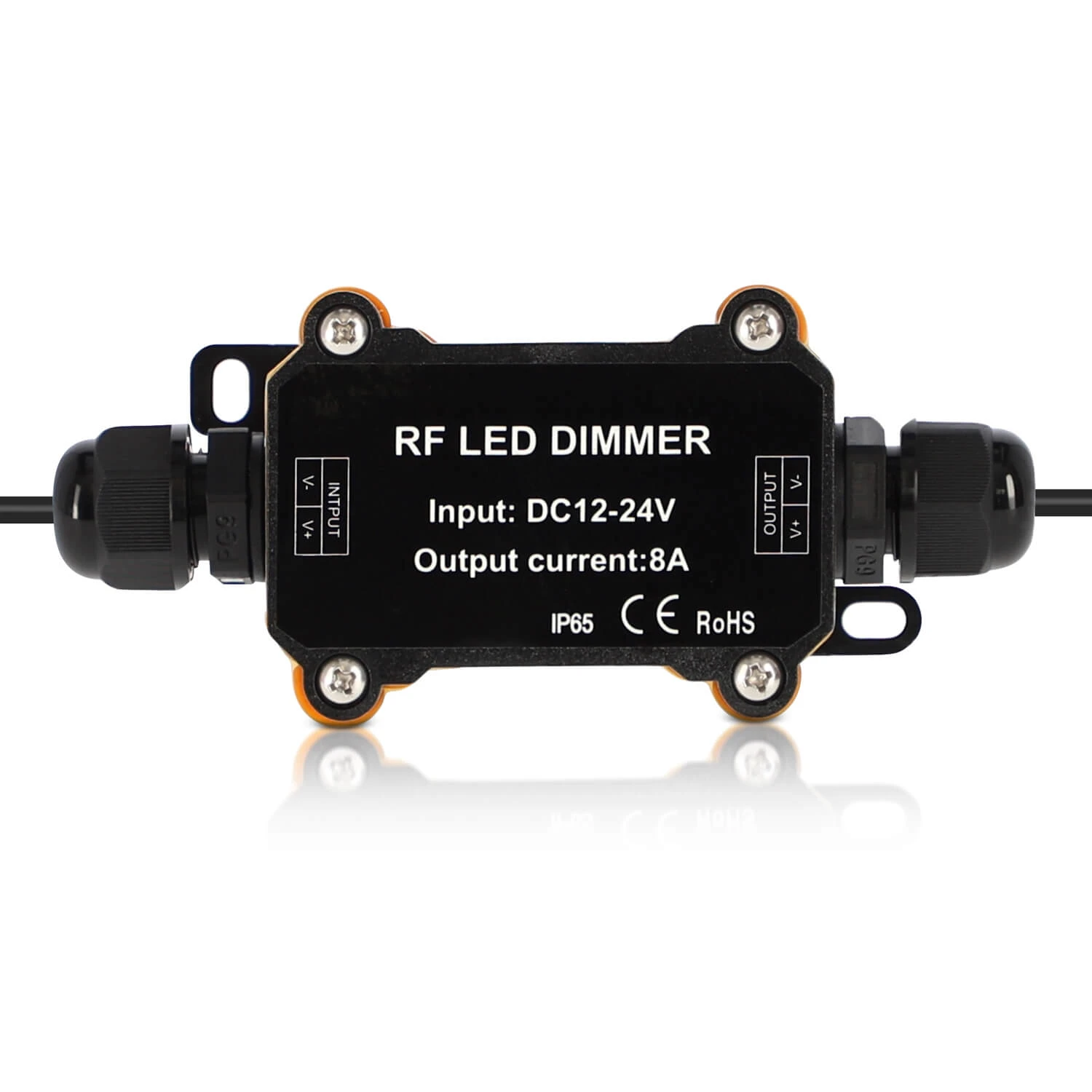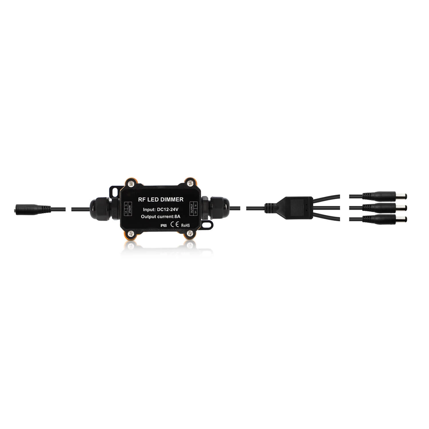 Da das Gehäuse einen Schutzgrad von IP67 erfüllt, steht einem Einsatz in Feuchträumen oder außerhalb des Hauses nichts im Wege. Im Lieferumfang enthalten sind neben dem Steuergerät und der Fernbedienung drei Hohlstecker, welche von uns vormontiert werden. Das Gerät ist somit plug-and-play-fähig und kann ohne großen Aufwand direkt mit Deinem Trafo und den Lichtbändern zusammengeschlossen werden. Damit hast Du eine komfortable und leistungsstarke Steuerung für Deine einfarbigen LED Bänder.