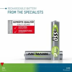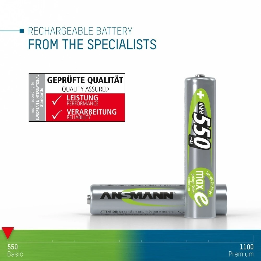 ANSMANN Nickel-Metallhydrid-Akku der Größe Micro / AAA / LR03 mit einer Spannung von 1,2 V und einer Kapazität von 550mAh; verpackt im 4er Blister, 2 Jahre Garantie