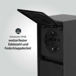 Hergestellt aus langlebigem Aluminium wurde die Steckdosensäule speziell für feuchte Umgebungen konzipiert und gründlich auf ihre Witterungsbeständigkeit getestet. Außerdem sind die Steckdosen selbst zweckmäßig durch Federklappdeckel geschützt. Mit ihrem Schutzgrad von IP44 ist die Gartensteckdose somit optimal für die Nutzung in Außenbereichen geeignet.