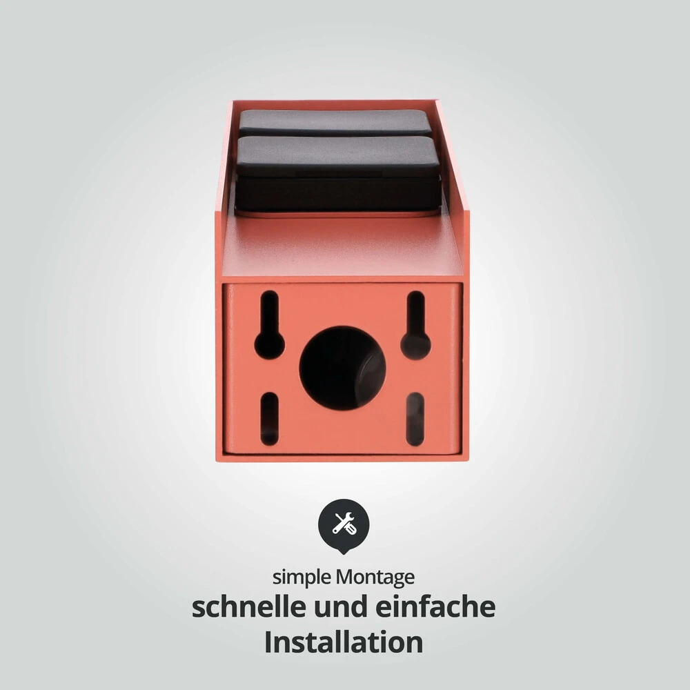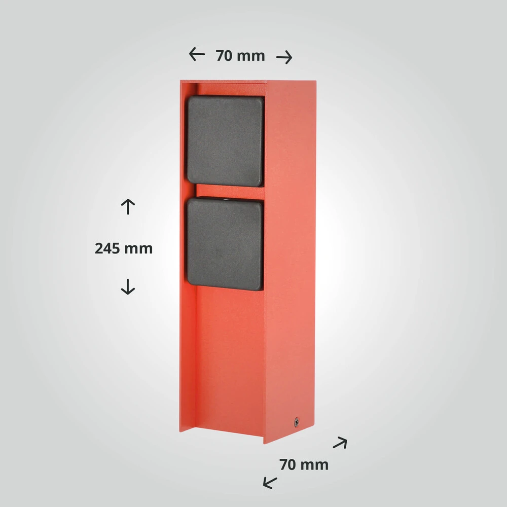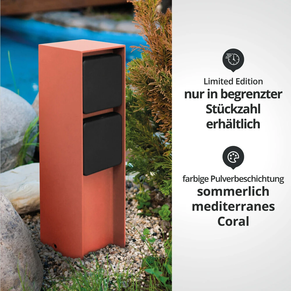 Die Pulverbeschichtung in Coral Rot verleiht der Außensteckdose einen schlichten, eleganten Look.