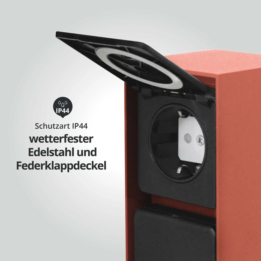 Hergestellt aus langlebigem Aluminium wurde die Steckdosensäule speziell für feuchte Umgebungen konzipiert und gründlich auf ihre Witterungsbeständigkeit getestet. Außerdem sind die Steckdosen selbst zweckmäßig durch Federklappdeckel geschützt. Mit ihrem Schutzgrad von IP44 ist die Gartensteckdose somit optimal für die Nutzung in Außenbereichen geeignet.
