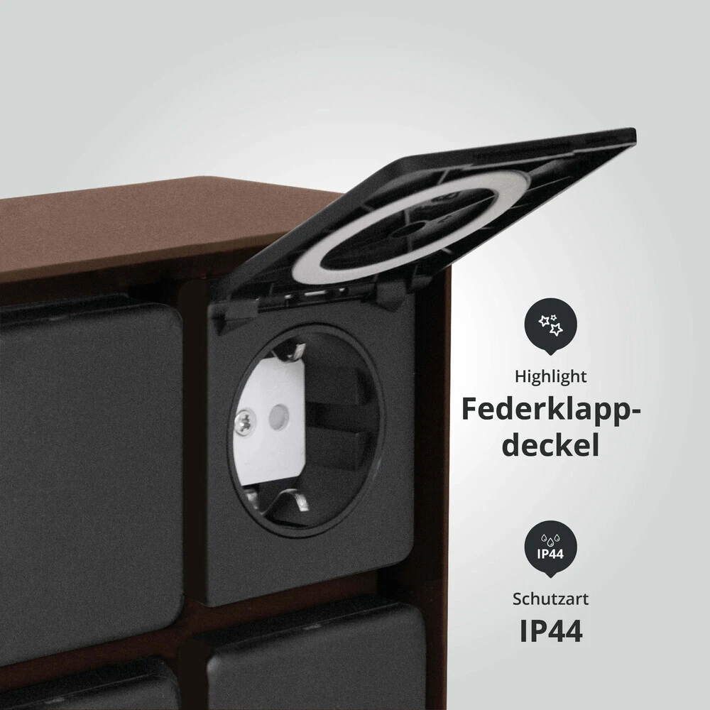 Hergestellt aus langlebigem Aluminium wurde die Steckdosensäule speziell für feuchte Umgebungen konzipiert und gründlich auf ihre Witterungsbeständigkeit getestet. Außerdem sind die Steckdosen selbst zweckmäßig durch Federklappdeckel geschützt. Mit ihrem Schutzgrad von IP44 ist die Gartensteckdose somit optimal für die Nutzung in Außenbereichen geeignet.