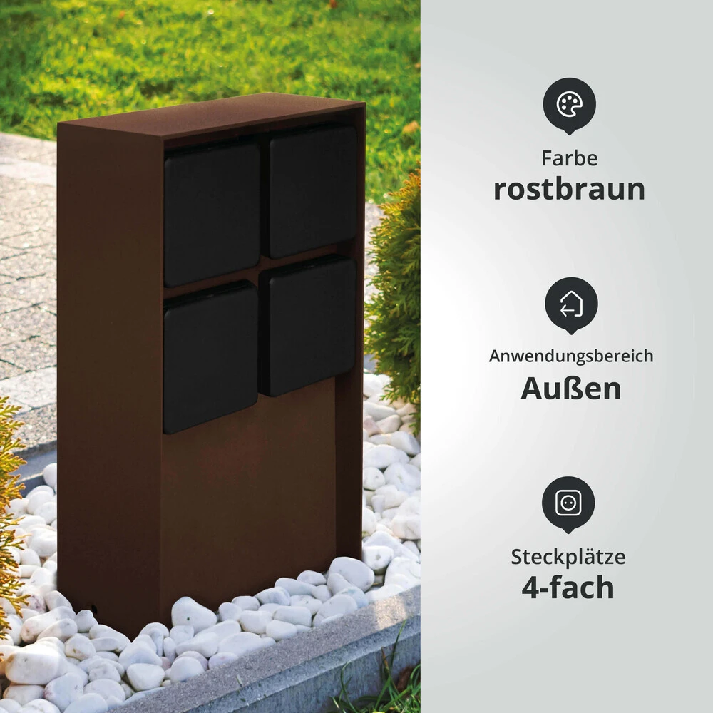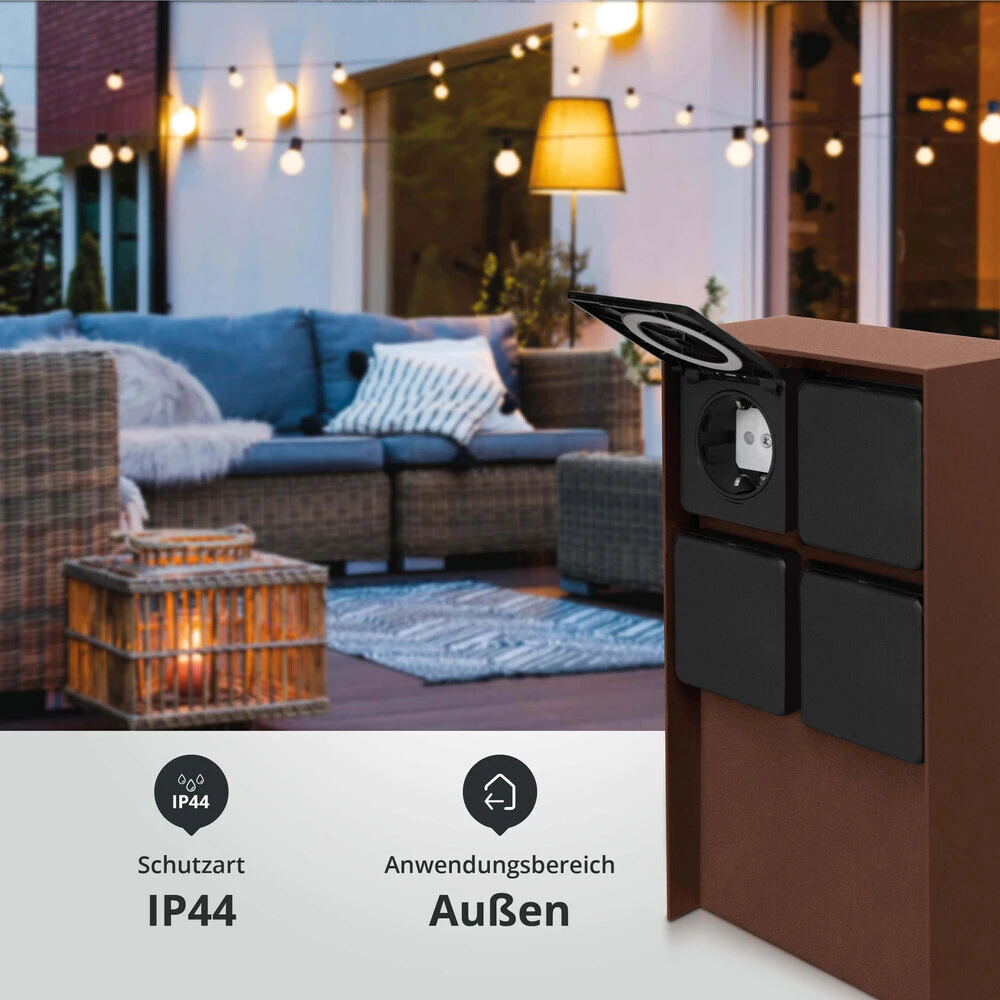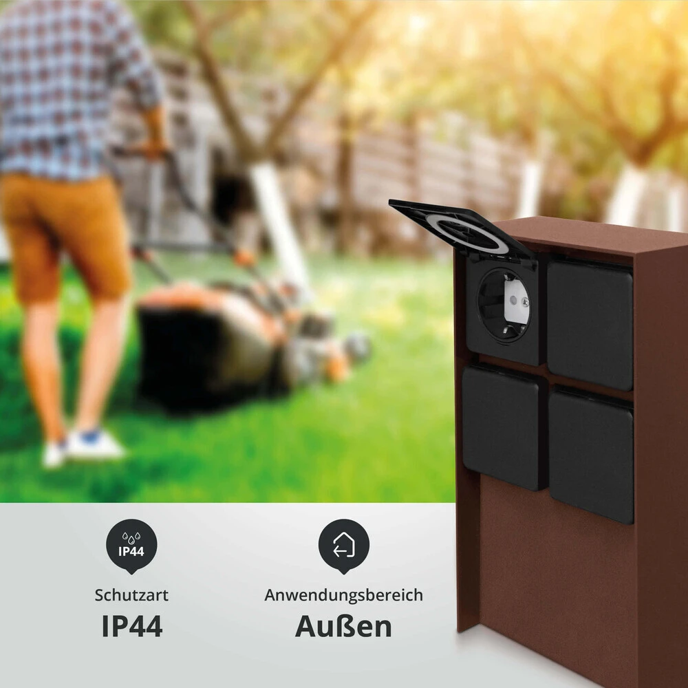 Diese rostbraune Steckdose ist die ideale Stromquelle für den Außenbereich und versorgt elektronische Anwendungen wie Außenbeleuchtung, Rasenmäher, Sprinkleranlagen oder Heckentrimmer kinderleicht mit Energie.