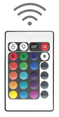 Mit der mitgelieferten 24 Tasten IR Fernbedienung kannst Du Daheim, in Bars und auf Messeständen präzise Deine Wunschfarbe einstellen und mit der Speichertaste sichern. Dabei sind mit der kleinen, handlichen und einfach zu bedienenden Steuerung 16 Farben vorwählbar. Die Lichtintensität kann gedimmt werden und es sind verschiedene Farbeffektprogramme hinterlegt – Flash, Strobe, Fade und Smooth -, deren Geschwindigkeiten Du ändern kannst.