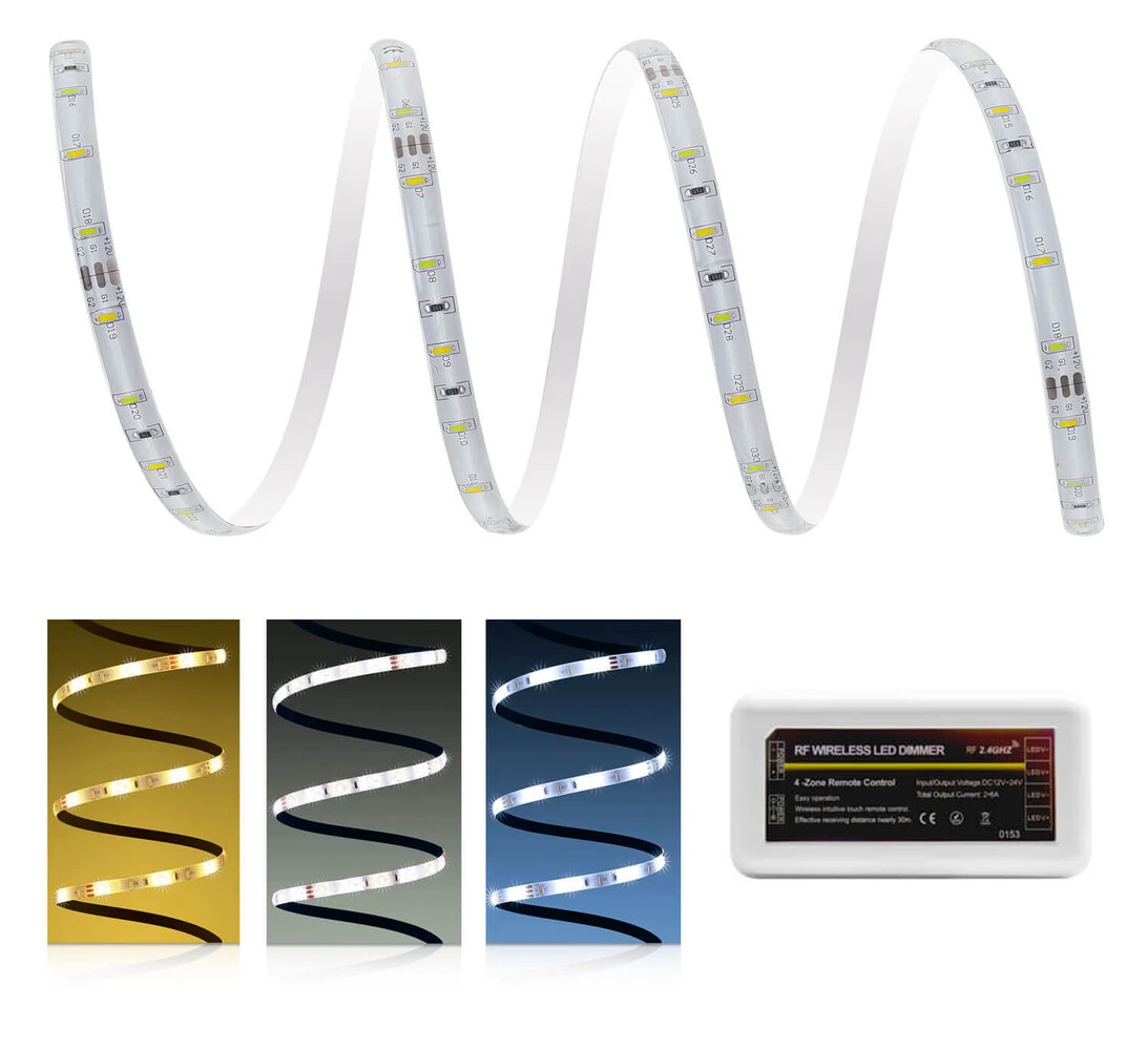 CCT steht für „Correlated Color Temperature“, was bedeutet, dass die Farbtemperatur Deiner LED Leiste durch die Regelung der Helligkeit der kaltweißen und warmweißen LEDs zueinander eingestellt wird. Hierbei handelt es sich um jeweils 30 warmweiße und 30 kaltweiße LEDs pro Meter. Auf diese Weise stellst Du die Farbtemperatur deines LED Streifens zwischen ca. 2700K und 6500K ein. Die verbauten LEDs Deines LED Streifens sorgen dafür, dass weder Schatten noch sichtbare Farbunterschiede zwischen den LEDs entstehen.