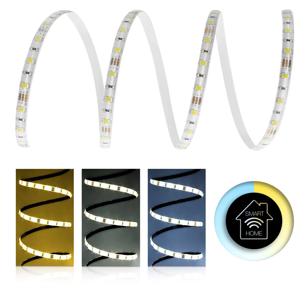 CCT steht für „Correlated Color Temperature“, was bedeutet, dass die Farbtemperatur Deiner LED Leiste durch die Regelung der Helligkeit der kaltweißen und warmweißen LEDs zueinander eingestellt wird. Hierbei handelt es sich um jeweils 60 warmweiße und kaltweiße LEDs pro Meter. Auf diese Weise stellst Du die Farbtemperatur deines LED Streifens zwischen ca. 2800K und 8500K ein. Die verbauten DUO LEDs Deines LED Streifens sorgen dafür, dass weder Schatten noch sichtbare Farbunterschiede zwischen den LEDs entstehen.