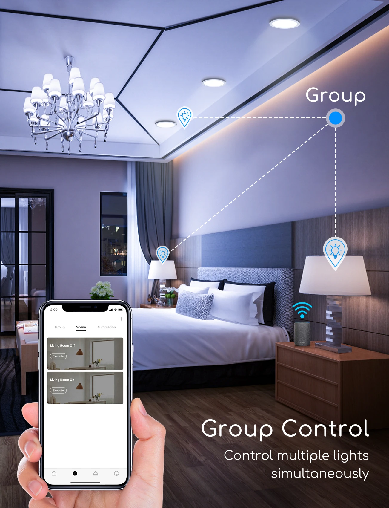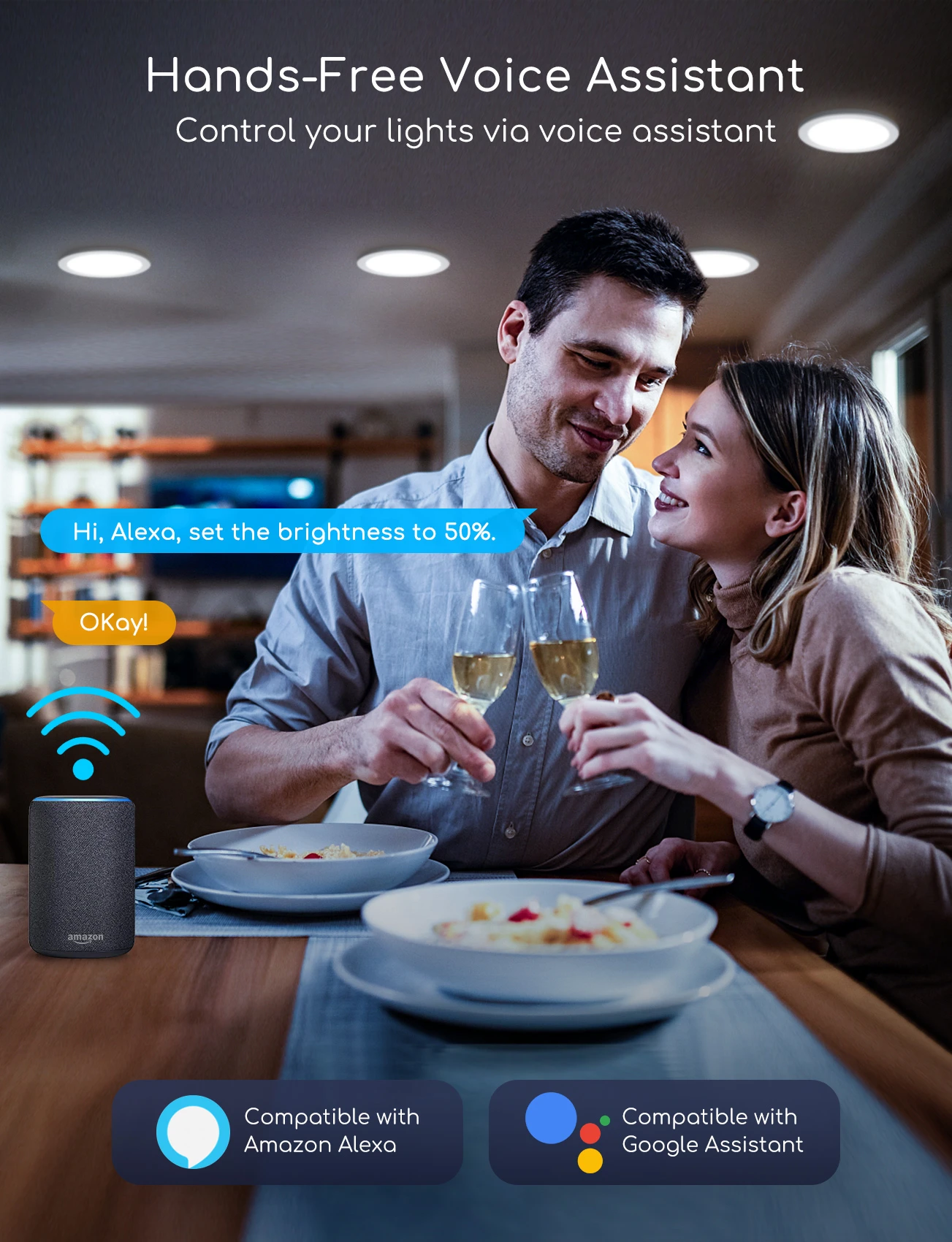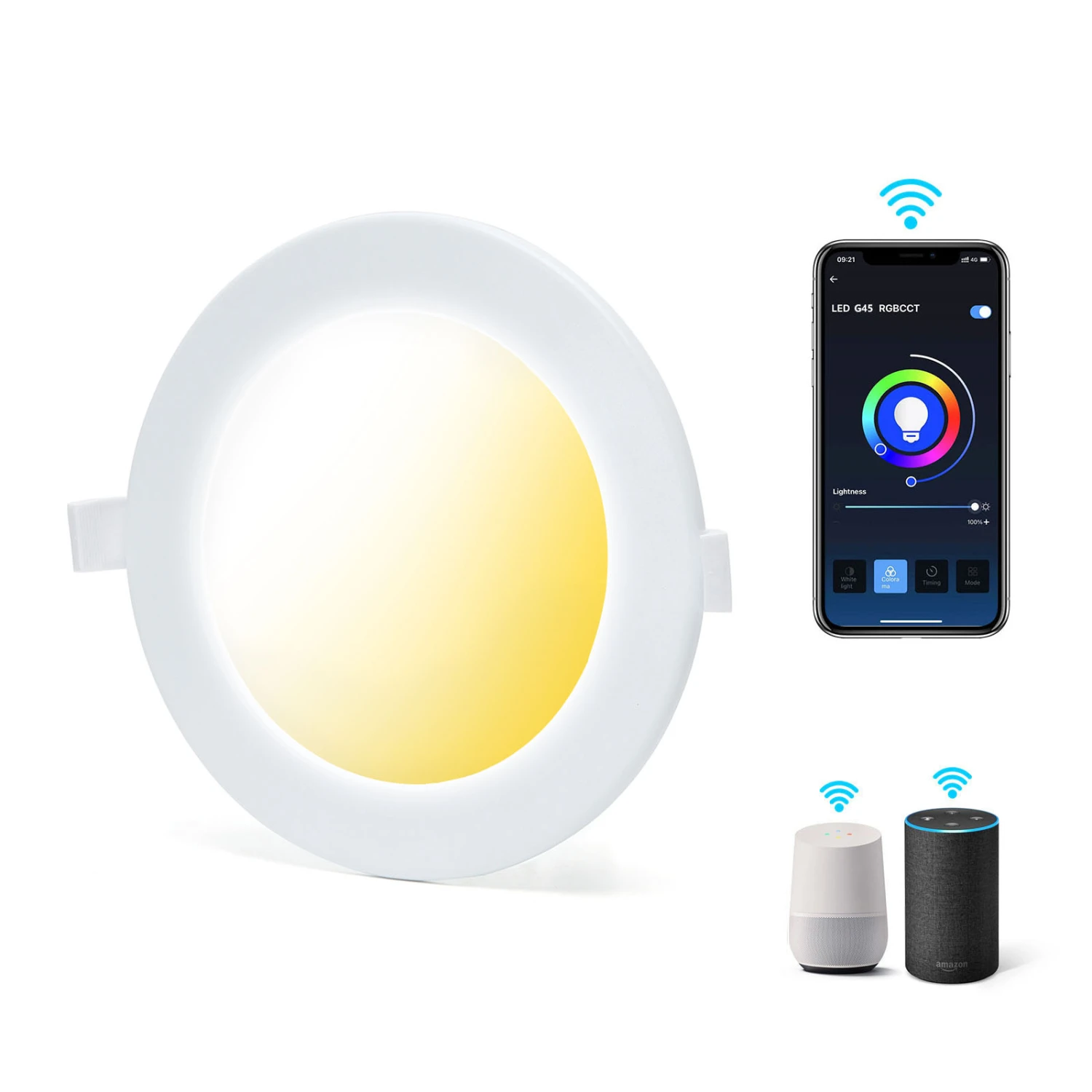 Das LED-Panel ist über WiFi/WLAN (2,4GHz) und Smartphone-App (z.B. SmartLife®) steuerbar, benötigt kein Gateway/Hub und ist kompatibel zu Google Assistant® und Amazon Alexa®