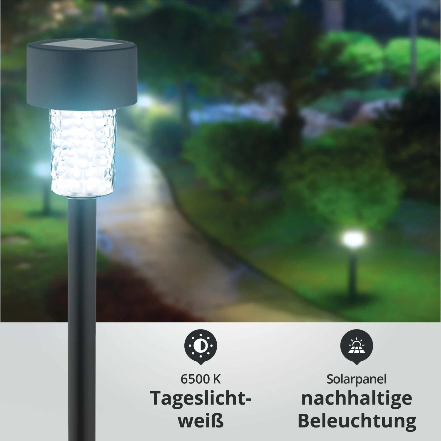 - SOLARBETRIEBENEN: Der Sonnenschein am Tag sorgt für 6 bis 10 Stunden Beleuchtung in der Nacht.