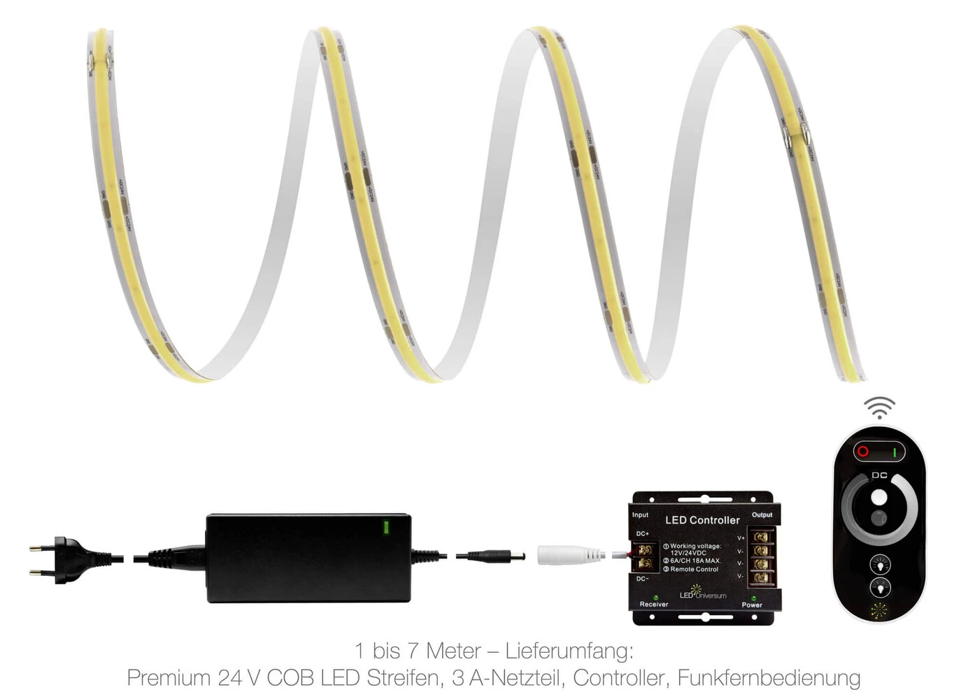 Dein Plug-&-Play-Set enthält alles, was Du brauchst: eine praktische Funksteuerung inklusive Fernbedienung mit Touch Pad und ein passendes Netzteil.