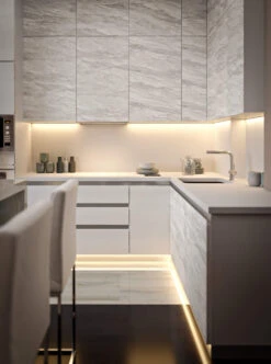 Besonders geeignet sind diese Bänder bei Installationen mit direktem Blick auf den LED Streifen wie z.B. in Küchen, als Arbeitsplatzbeleuchtung, für den Schreibtisch oder als Möbeleinbauleuchte.