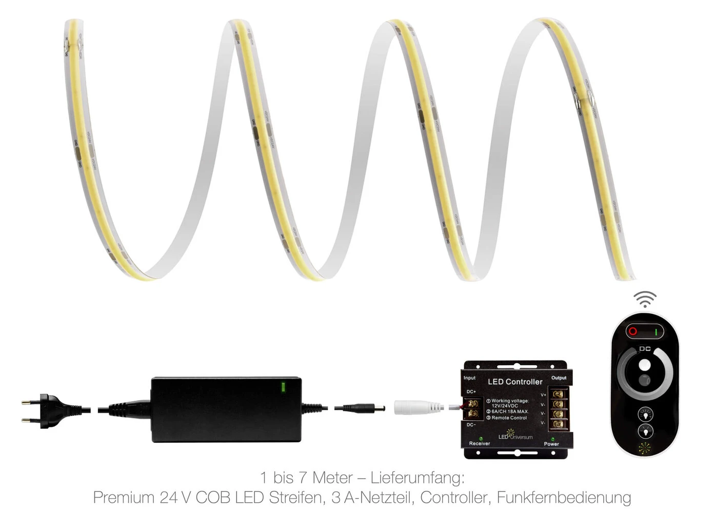 Mit unseren COB LED Streifen sind flexible LED Streifen verfügbar, die viele Vorteile miteinander vereinen. So erzeugen COB (Chip-on-Board) LED Streifen