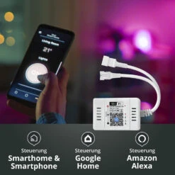 Die Steuerung des LED Streifens ist äußerst flexibel. Du kannst den Streifen mit einem WiFi Controller für digitale LED Streifen steuern und per App auf deinem Smartphone oder Tablet smart programmieren. Dies ermöglicht dir eine bequeme und intuitive Bedienung. Alternativ kannst du auch eine gewählte IR Fernbedienung verwenden, um den Streifen anzusteuern und die gewünschten Lichteffekte zu erzeugen.