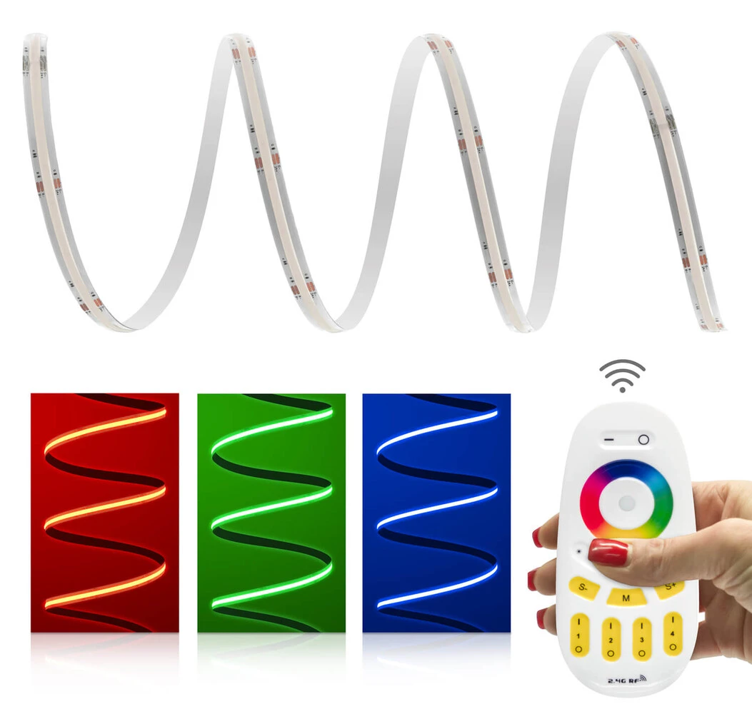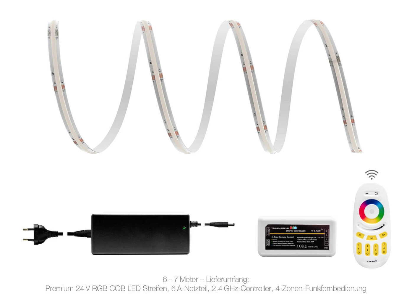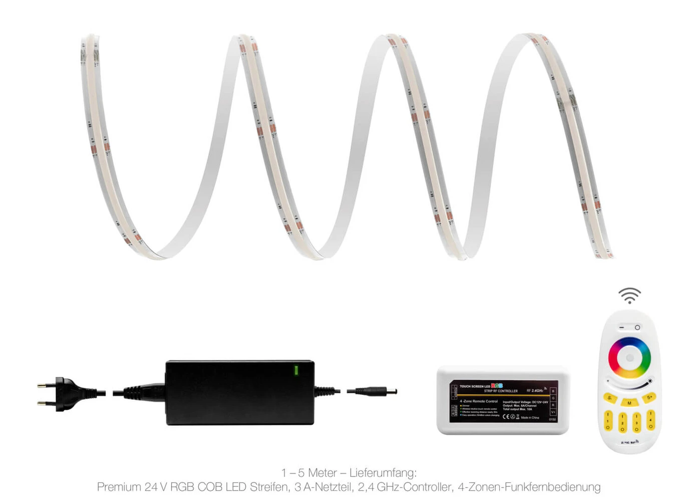 Das RGB COB LED Band wird von 1 Meter bis 6 Meter maßgefertigt. Die Lieferung erfolgt mit einer 4 poligen Steckbuchse mit 15cm langem Kabel. Für eine schnelle und einfache Installation ist der LED Stripe mit doppelseitigem Klebeband auf der Rückseite ausgestattet.
