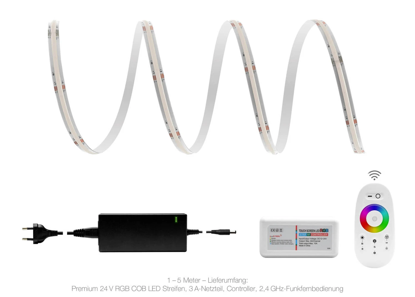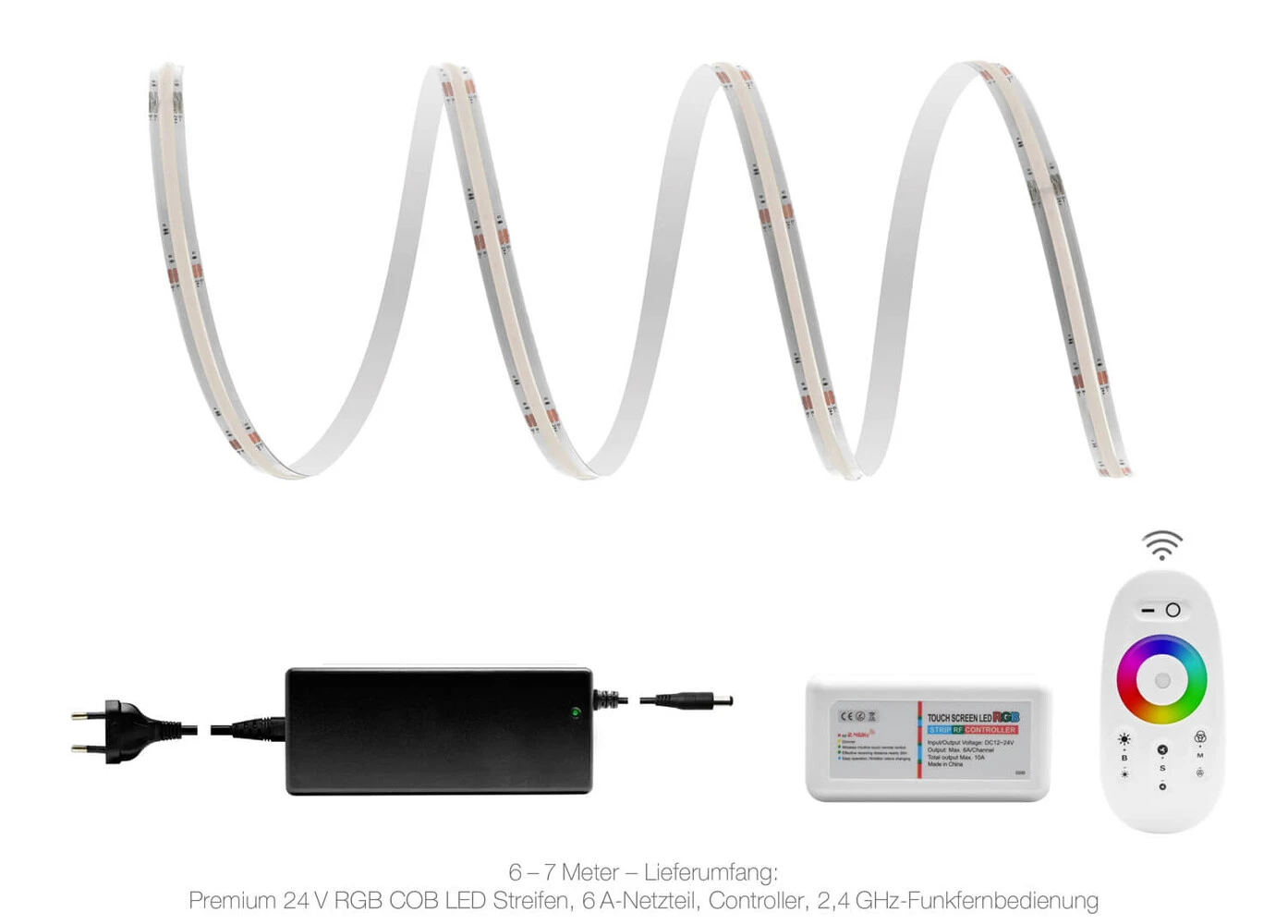 Das RGB COB LED Band wird von 1 Meter bis 6 Meter maßgefertigt. Die Lieferung erfolgt mit einer 4 poligen Steckbuchse mit 15cm langem Kabel. Für eine schnelle und einfache Installation ist der LED Stripe mit doppelseitigem Klebeband auf der Rückseite ausgestattet.