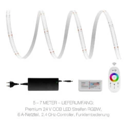 Das RGBW COB LED Band wird von 1 Meter bis 7 Meter maßgefertigt. Die Lieferung erfolgt mit einer 5 poligen Steckbuchse mit 15cm langem Kabel. Für eine schnelle und einfache Installation ist der LED Stripe mit doppelseitigem Klebeband auf der Rückseite ausgestattet.