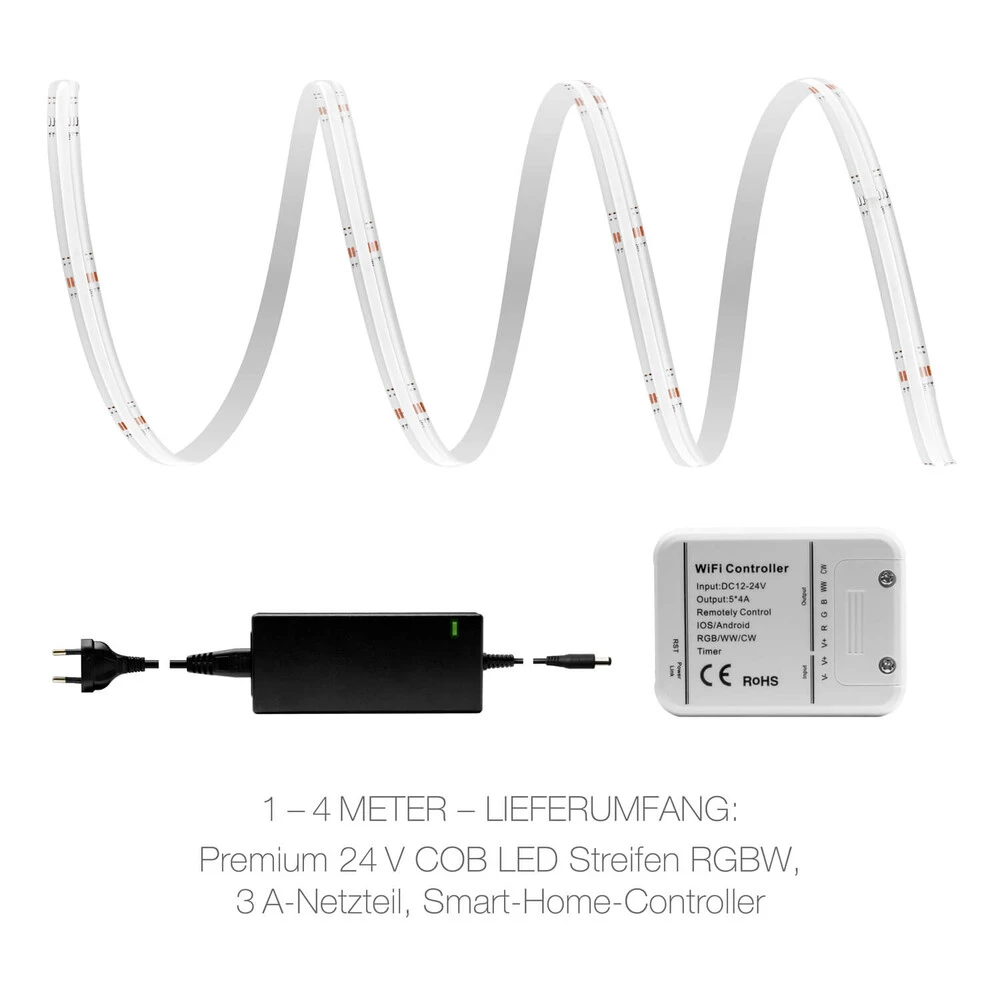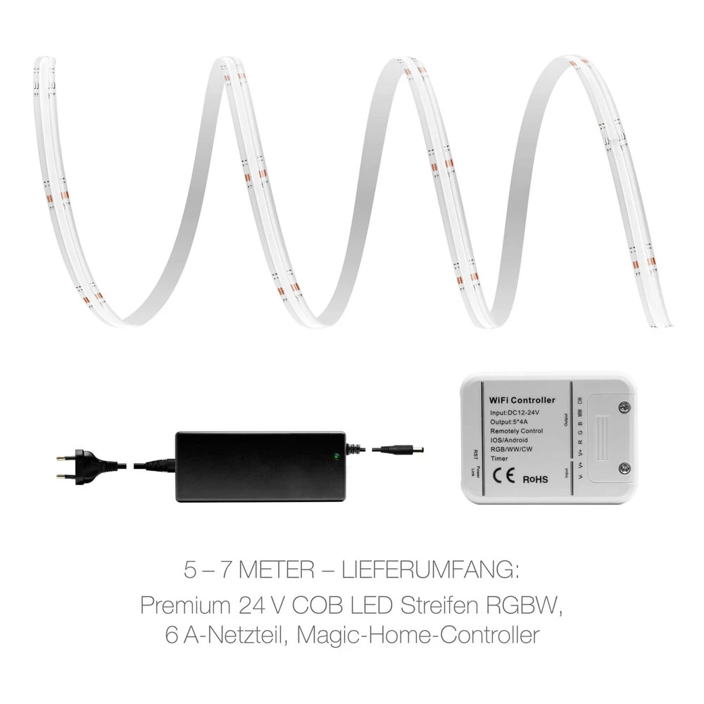 Das RGBW COB LED Band wird von 1 Meter bis 7 Meter maßgefertigt. Die Lieferung erfolgt mit einer 5 poligen Steckbuchse mit 15cm langem Kabel. Für eine schnelle und einfache Installation ist der LED Stripe mit doppelseitigem Klebeband auf der Rückseite ausgestattet.