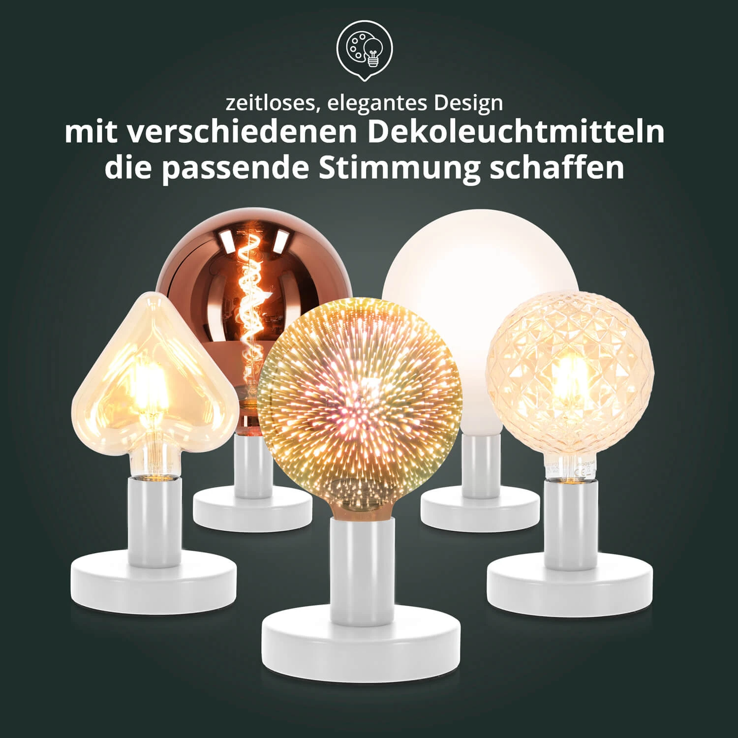 Noch dazu ist sie optisch extrem wandelbar, da man jegliche E27 Leuchtmittel (bis 40W) einsetzen kann. Dadurch kann man zusätzlich verschiedene Raumstimmungen und Dekostile erzeugen und ausprobieren. Voll im Trend dazu, sind die tollen Deko Leuchtmittel in allen Formen und Farben, welche ebenfalls bei uns im Shop erhältlich sind.